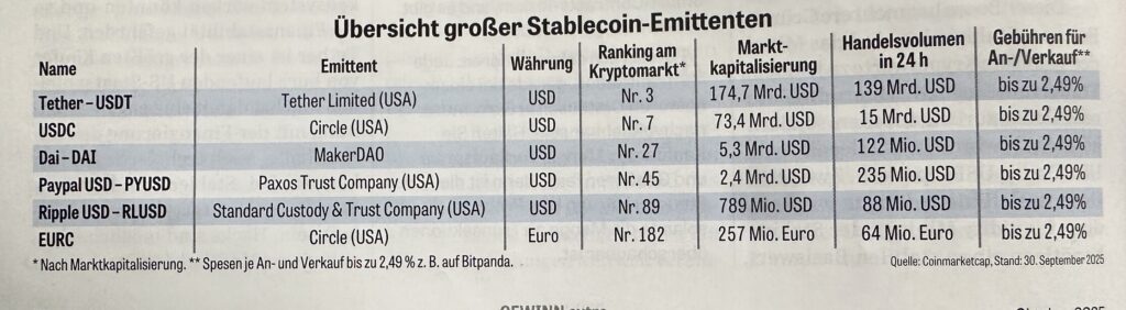 Drittens: Für Überweisungen ins Ausland bieten Stablecoins erhebliche Vorteile: geringere Kosten, schnellere Abwicklung und Verfügbarkeit rund um die Uhr. Die EZB erkennt an, dass sie im grenzüberschreitenden Kontext kostengünstigere und schnellere Zahlung ermöglichen können. Viele Investoren locken einige Kryptobörsen mit Jahreszinsen von sechs Prozent und mehr für die Einlage von Stablecoins. Diese sind jedoch nicht durch eine Einlagensicherung gedeckt – das Risiko bleibt alleine beim Anleger.